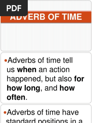 Adverbs that can appear in this position include: Many adverbs of time are the same as adverbs of frequency. It tells us when an action happened besides how long, how often. Adverbs of time and definite frequency say when or how often something happens. The position of the adverb depends on your intention